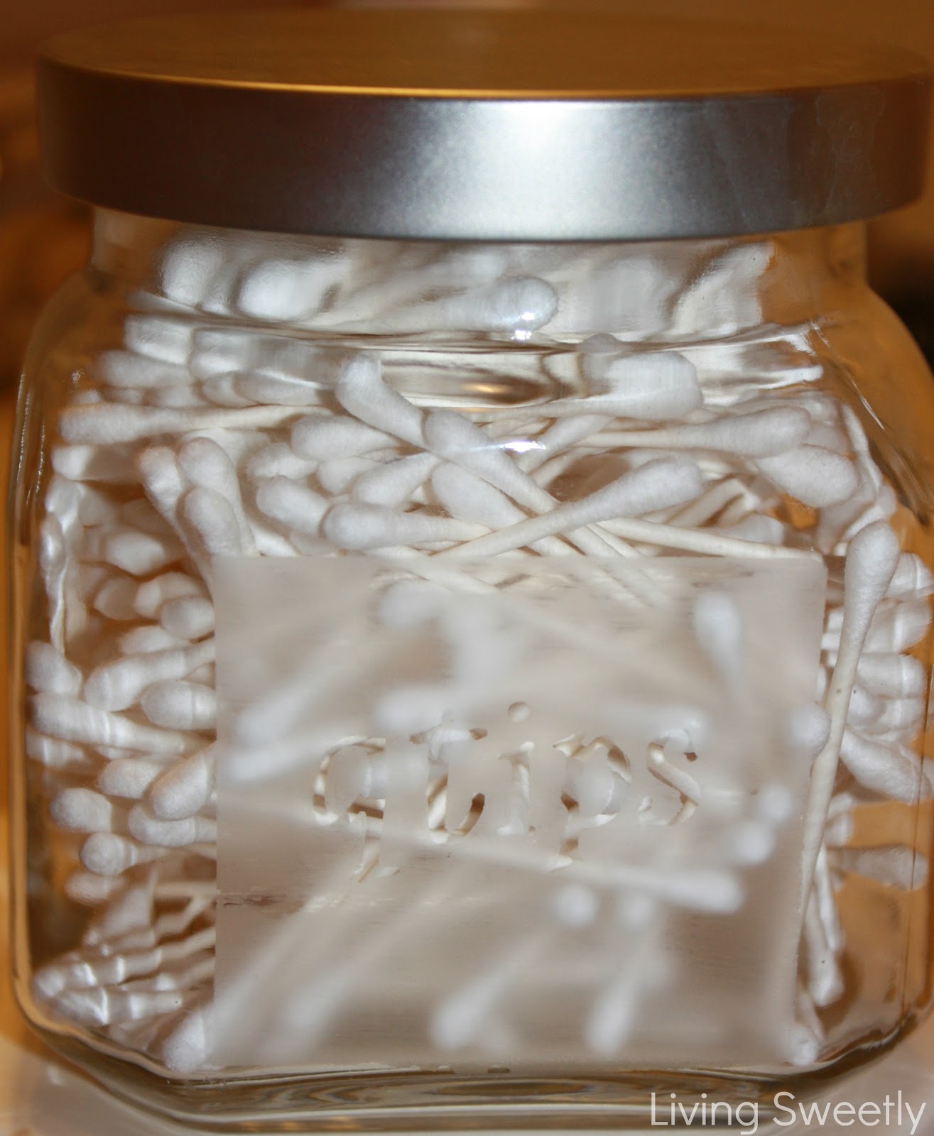 I wanted to share a quick tutorial with you! I love the etched glass look but did NOT want to pay someone to etch a jar that will hold my Q-Tips and cotton balls! I did a little investigating and figured out how to get the same look on my own!